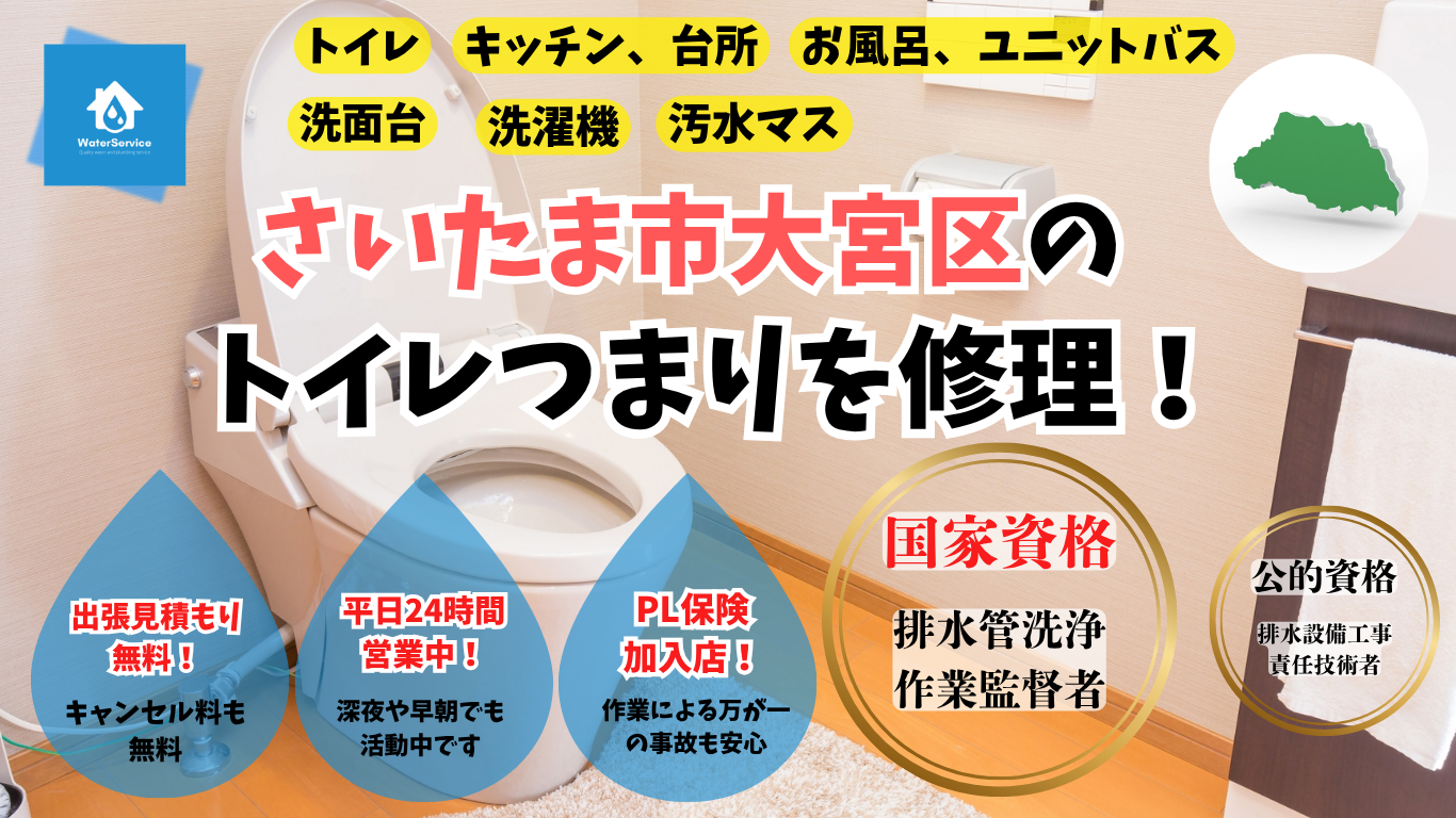 トイレ詰まり救急専門店は、さいたま市大宮区にお住まいのご家庭の排水トラブルに対して、親身なサービスと迅速かつ柔軟な対応をいたします。